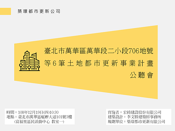 依據都市更新條例第32條第二項、第48條:變更都市更新事業計畫期間,應舉辦公聽會,聽取民眾意見;都市更新條例施行細則第8條:舉辦公聽會時,應邀請有關機關、學者專家及當地居民代表及通知更新單元內土地、合法建築物所有權人、他項權利人、囑託限制登記機關及預告登記請求權人參加,並以傳單周知更新單元內門牌戶。公聽會之日期及地點,應於十日前刊登當地政府公報或新聞紙三日,並張貼於當地村(里)辦公處之公告牌;其依本條例第三十二條第二項或第三項辦理者,並應於專屬或專門網頁周知。