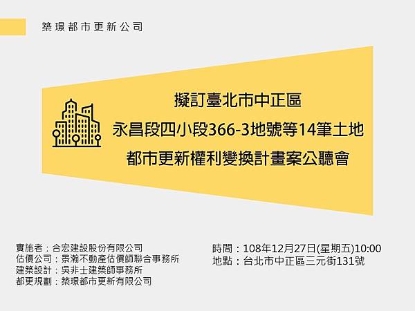 開會事由:「變更臺北市士林區百齡段五小段107地號等2筆土地都市更新事業及權利變換計畫案」公聽會